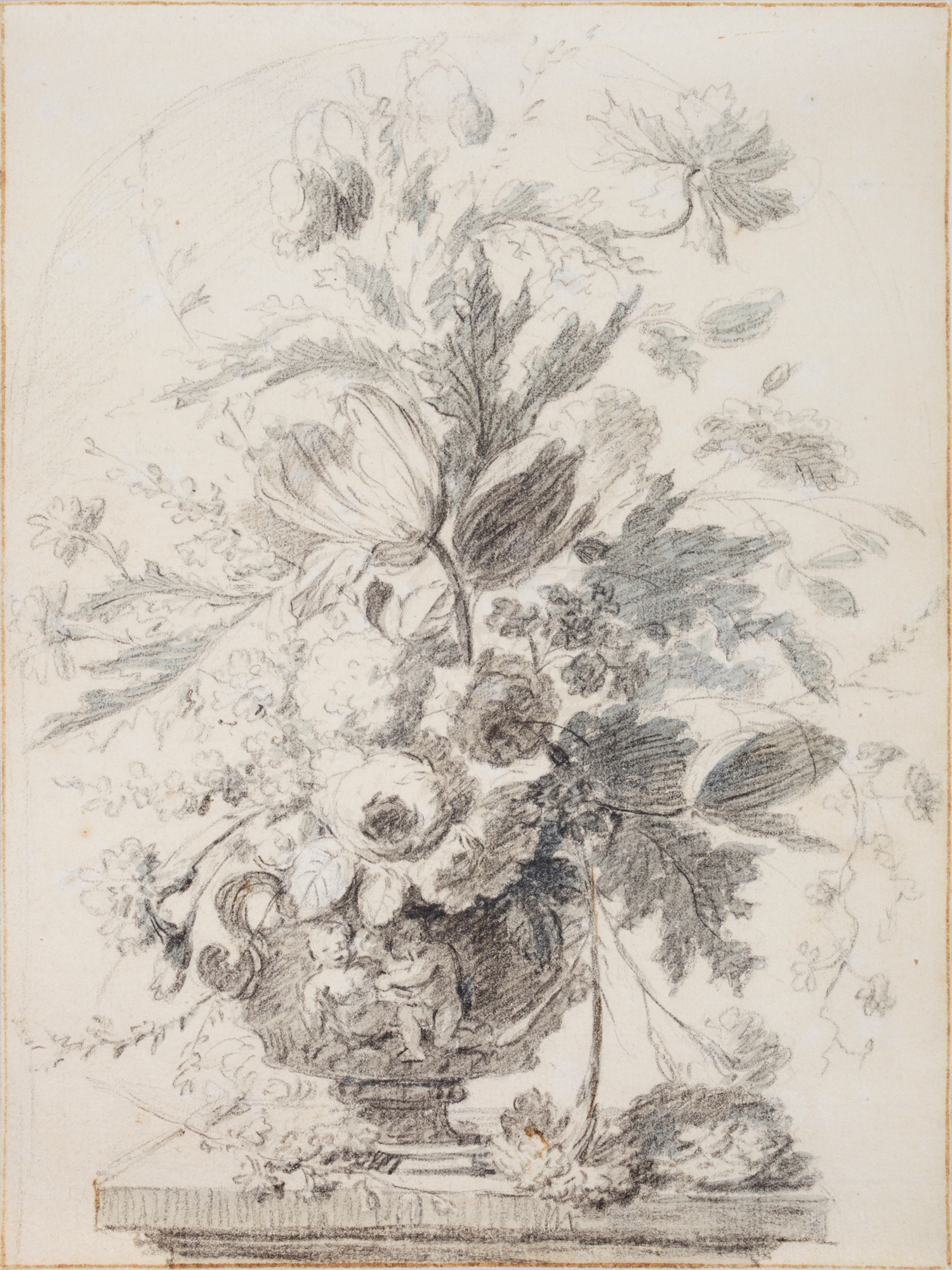 Jan van Huysum was one of the most outstanding Dutch flower painters of the eighteenth century. He was celebrated during his lifetime for his meticulously rendered flowers and the high level of realism of his paintings. Van Huysum worked directly from nature, an understandably slow process that could involve waiting for a season to return in order to finish certain flowers. The present drawing, executed with a free and lose hand, is characteristic of the drawings executed by van Huysum to prepare his paintings. In these drawings, Van Huysum explored arrangements of color and shape, and the flowers are rarely defined.